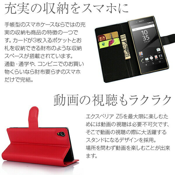 商品名称SONY Xperia Z5 SO-01H/SOV32 レザー手帳型ケース適応機種SONY エクスペリア Z5 ドコモ:SO-01H au:SOV32ソフトバンクカラーブラックブラウンホワイトピンクマゼンタグリーンレッドパープルブルー素材PUレザー商品説明充実の収納をスマホに 手帳型のスマホケースならではの充実の収納も商品の特徴の一つです。
